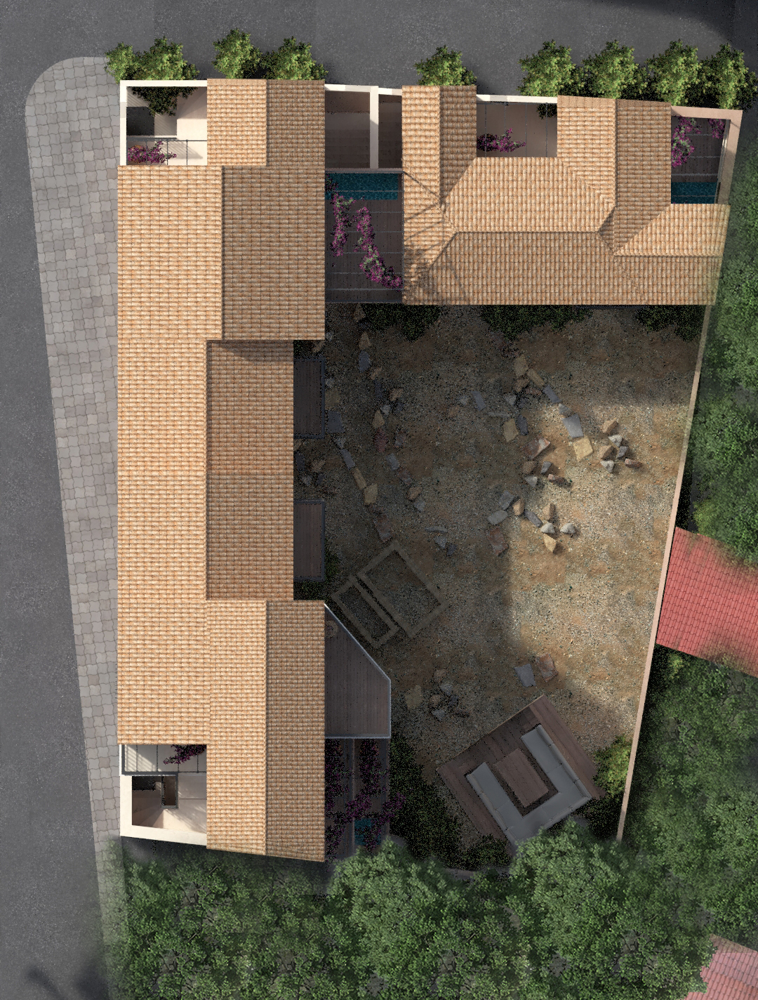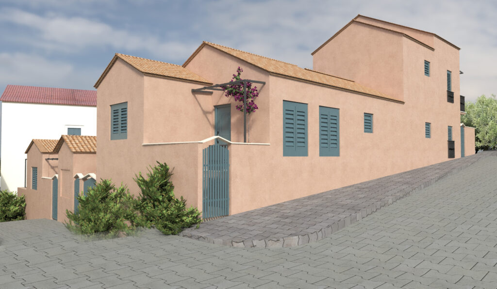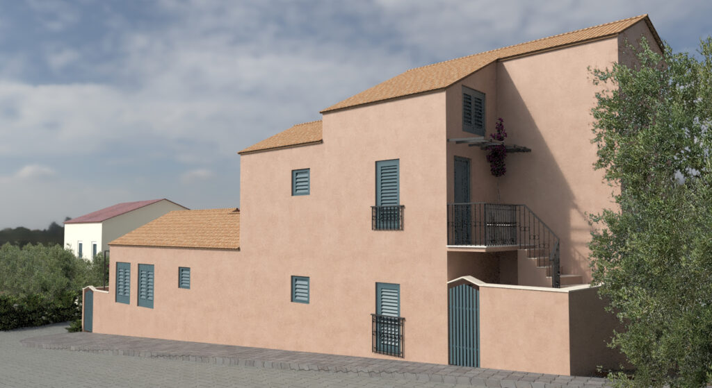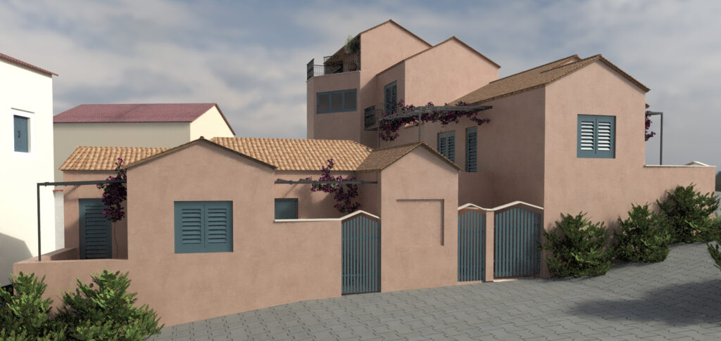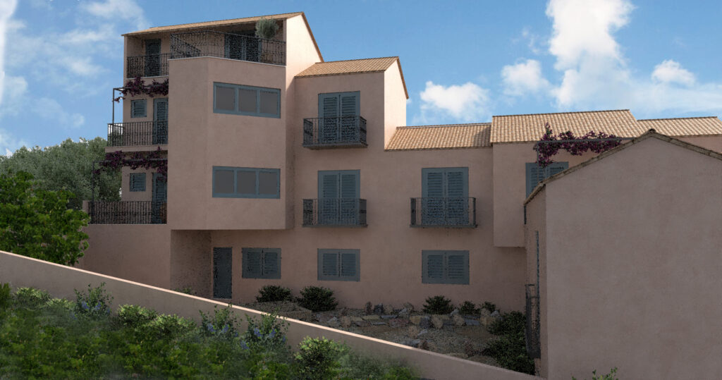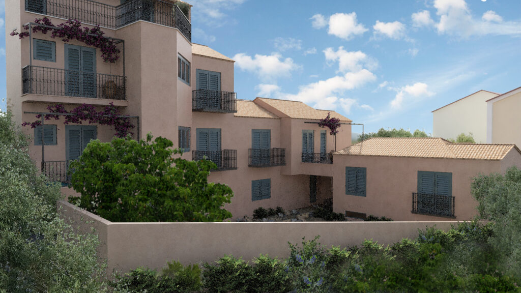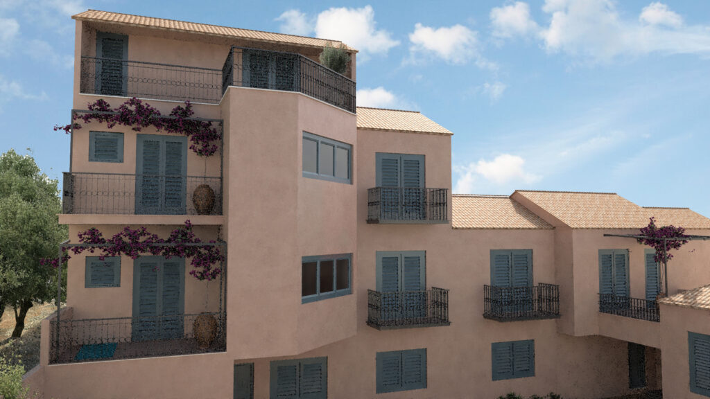 Συγκρότημα τουριστικών κατοικιών στο Φισκάρδο Κεφαλλονιάς. Η ιδιαίτερη λύση μηχανικής που εφαρμόστηκε στη συγκεκριμένη περίπτωση αφορά στα μεγάλα ανοίγματα των προβόλων, διατηρώντας ανέπαφες τις αναδυόμενες αρχαιότητες, όπου προστατεύοντάς τις αναδεικνύεται η ιστορική τους αξία. Η αρχιτεκτονική του κτιρίου εμπνέεται από παραδοσιακά πρότυπα της προστατευόμενης περιοχής του Φισκάρδου, με βασικούς άξονες το σεβασμό στις αρχαιότητες και τη θέα στη θάλασσα.