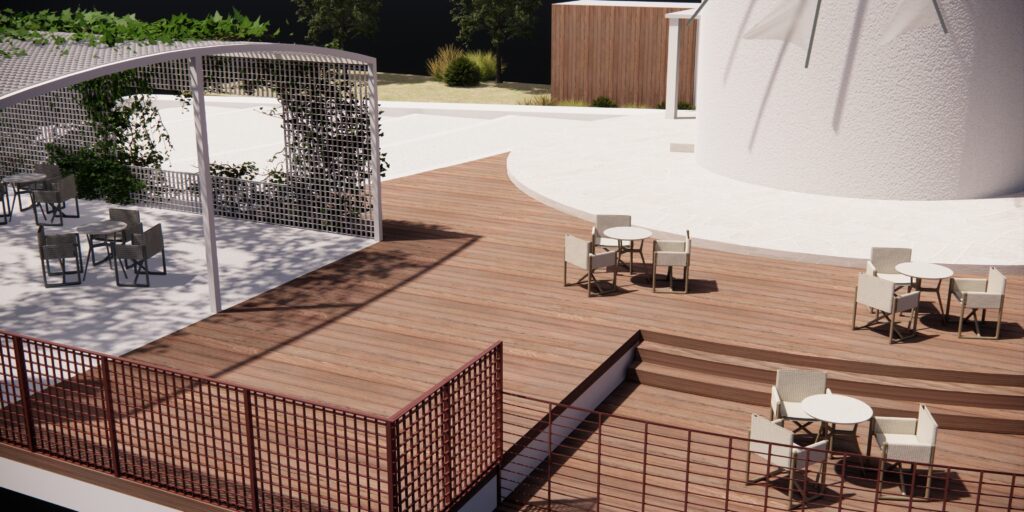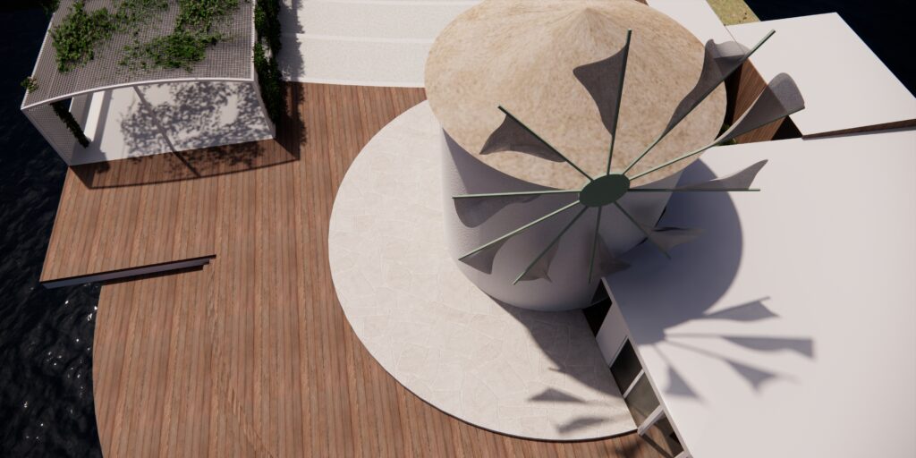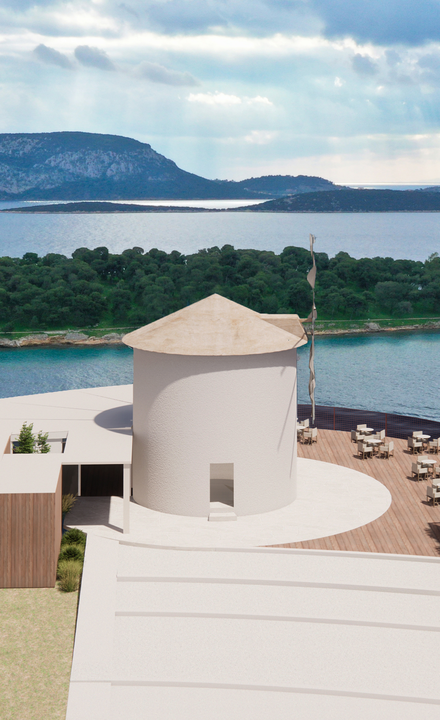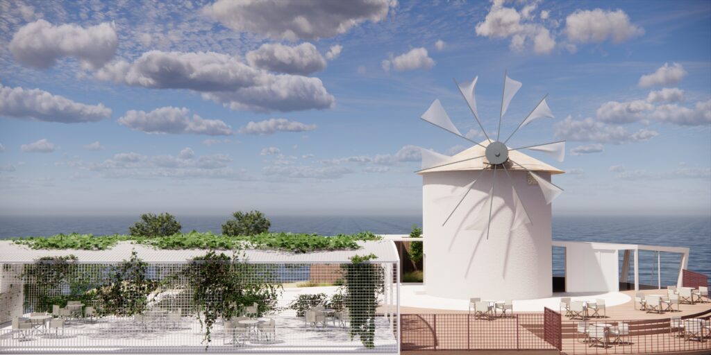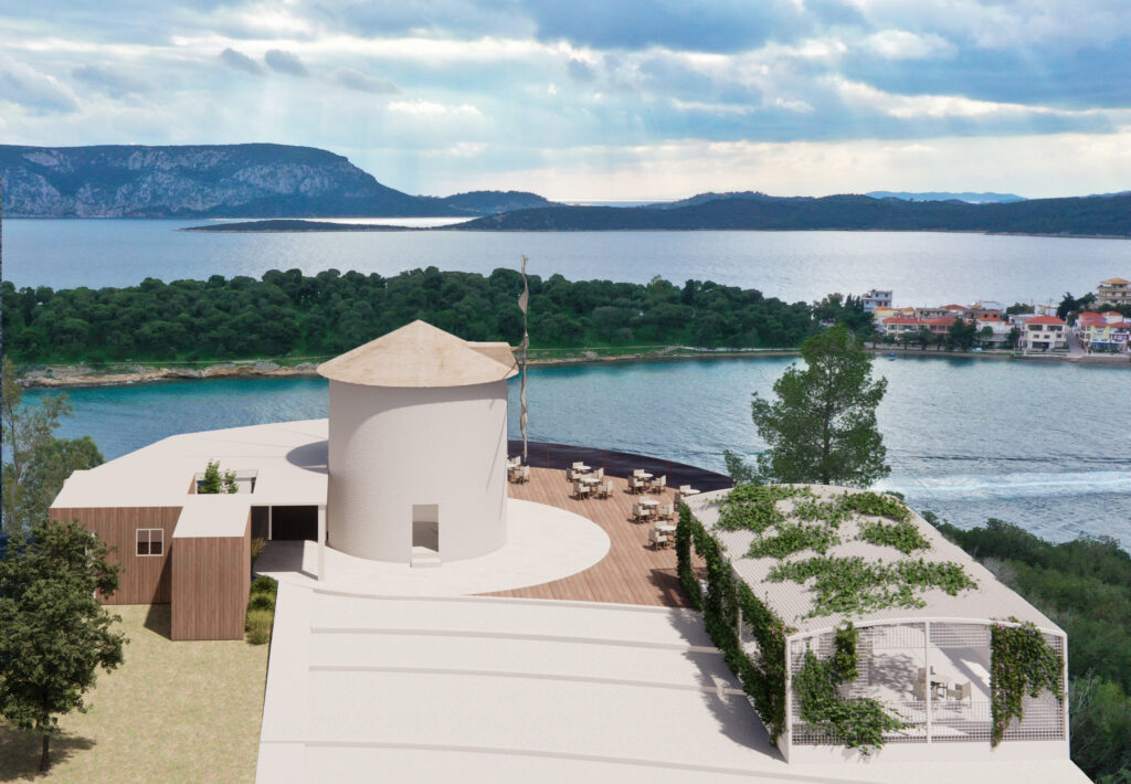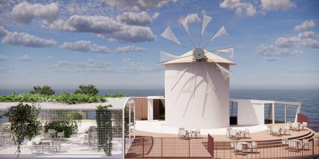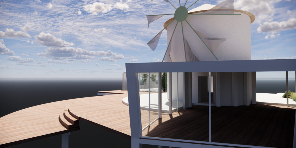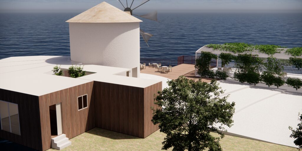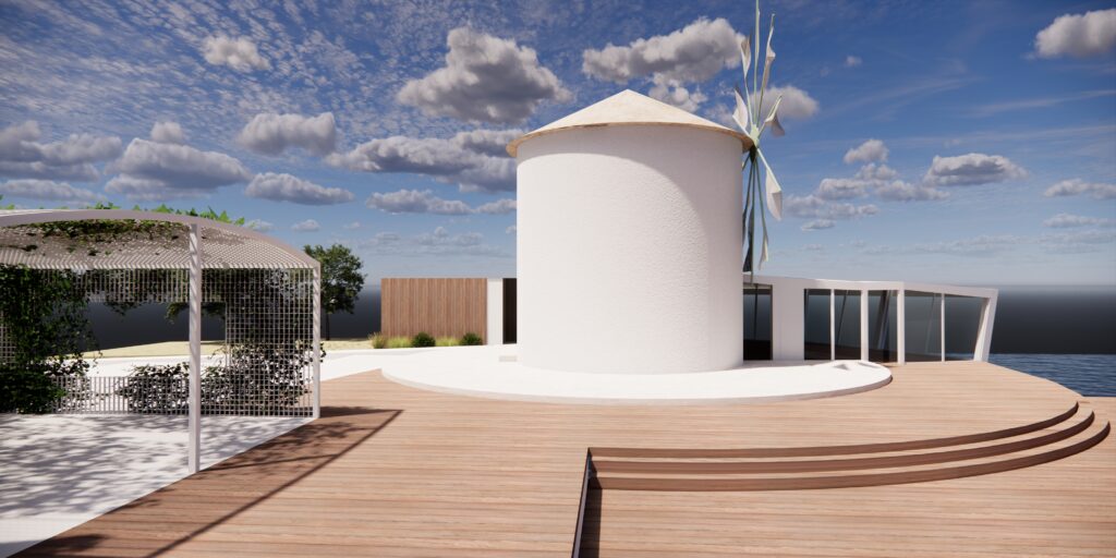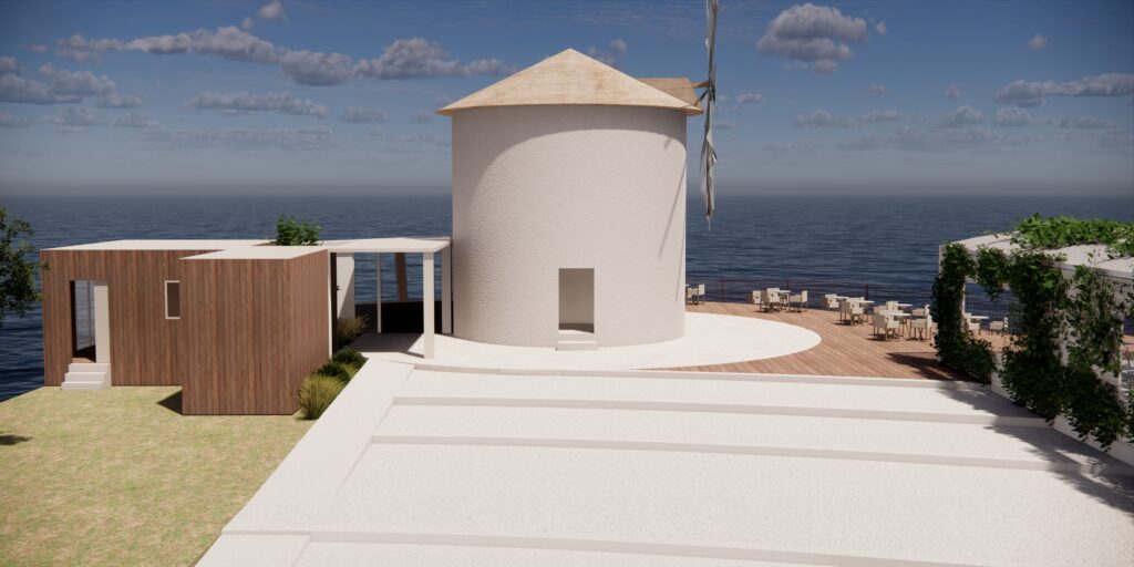 Πρόκειται για την δομική αποκατάσταση και την μορφολογική βελτίωση του ανεμόμυλου προκειμένου αυτός να συνάδει με την ιστορική μορφή των ιδιαίτερων αυτών προβιομηχανικών κτισμάτων. Ιδιαίτερος ο φέροντας οργανισμός της μεταλλικής κατασκευής, με τα υποστυλώματα να βρίσκονται υπό κλίση στην απόληξη του στεγάστρου με ισχυρές αναφορές στην γεωμετρική ταυτότητα της πλώρης των πλοίων, μνεία στη θαλασσινή έκταση που εκτείνεται μπροστά.